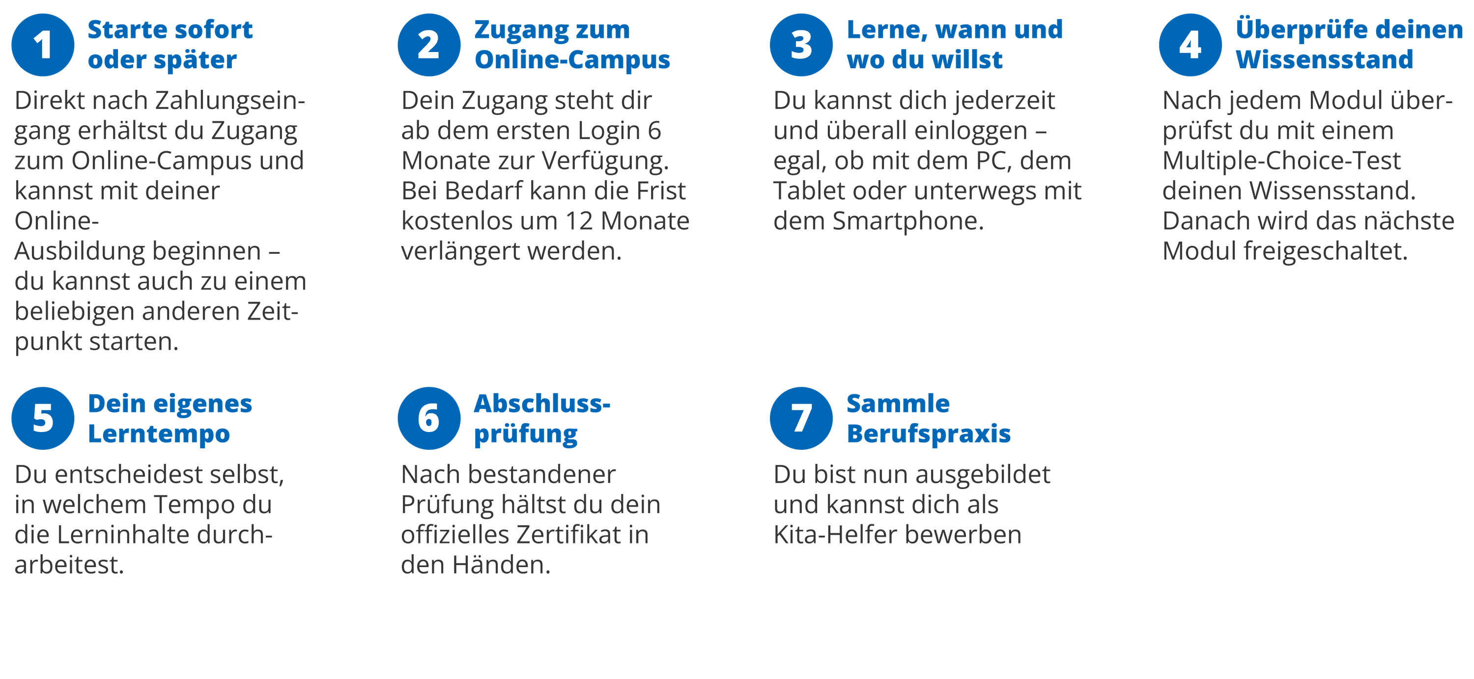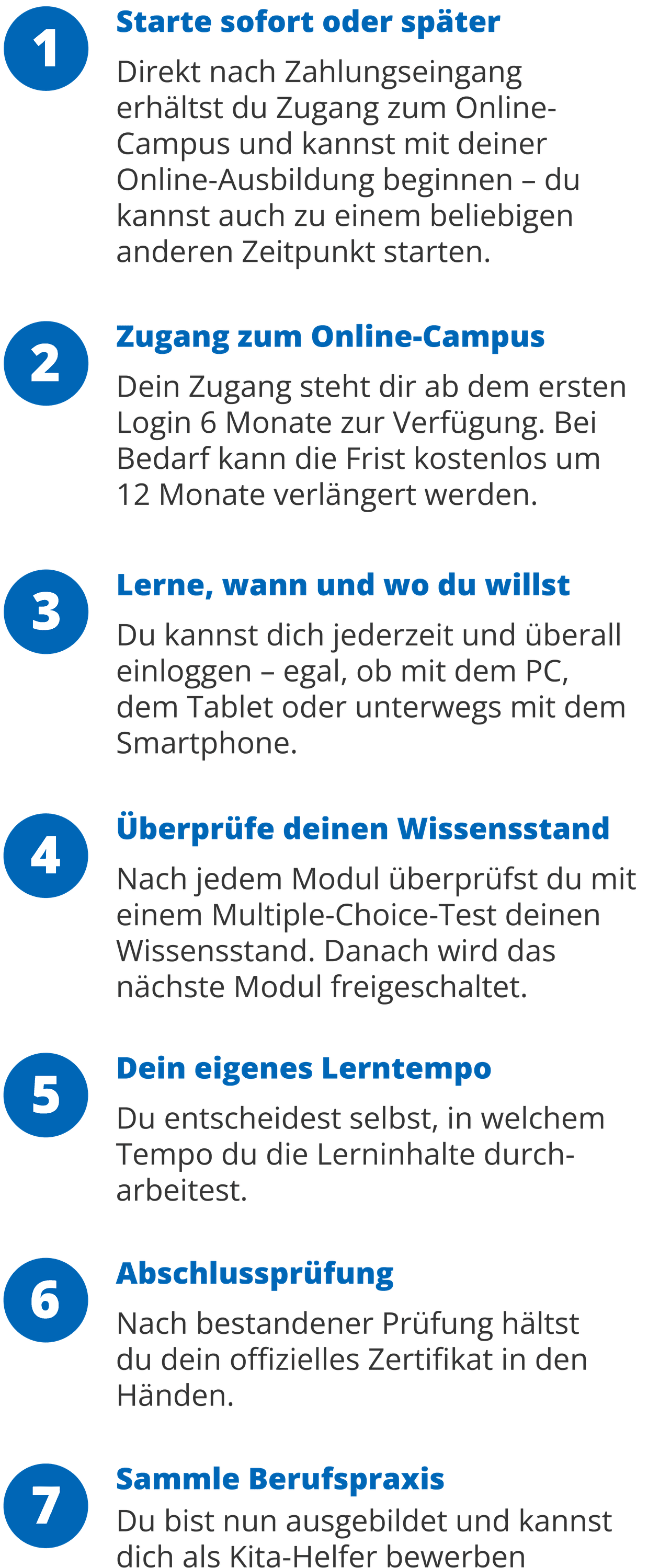 Dafür ist es lediglich notwendig, die Lernfragen zwischen den Modulen zu bearbeiten und einen kleinen Test nach dem letzten Modul zu absolvieren.